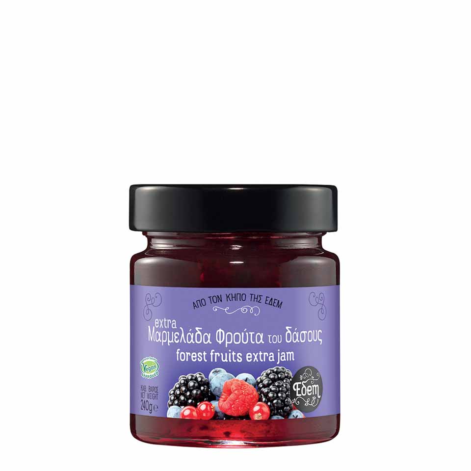 Τα πιο ζουμερά και διαλεχτά κομμάτια από φρούτα του δάσους της Εδέμ. Τα 100γρ. μαρμελάδας περιέχουν 55γρ. φρούτων. Χωρίς χρωστικές ουσίες και συντηρητικά. Ιδανική για το πρωινό στο ψωμί στη φρυγανιά ή στο γιαούρτι, ως γαρνίρισμα και extra γεύση σε τούρτες, κρέπες, pancakes, παγωτά ή ως γέμιση σε μπισκότα, αλλά και σαν dressing σαλάτας και ψητών.