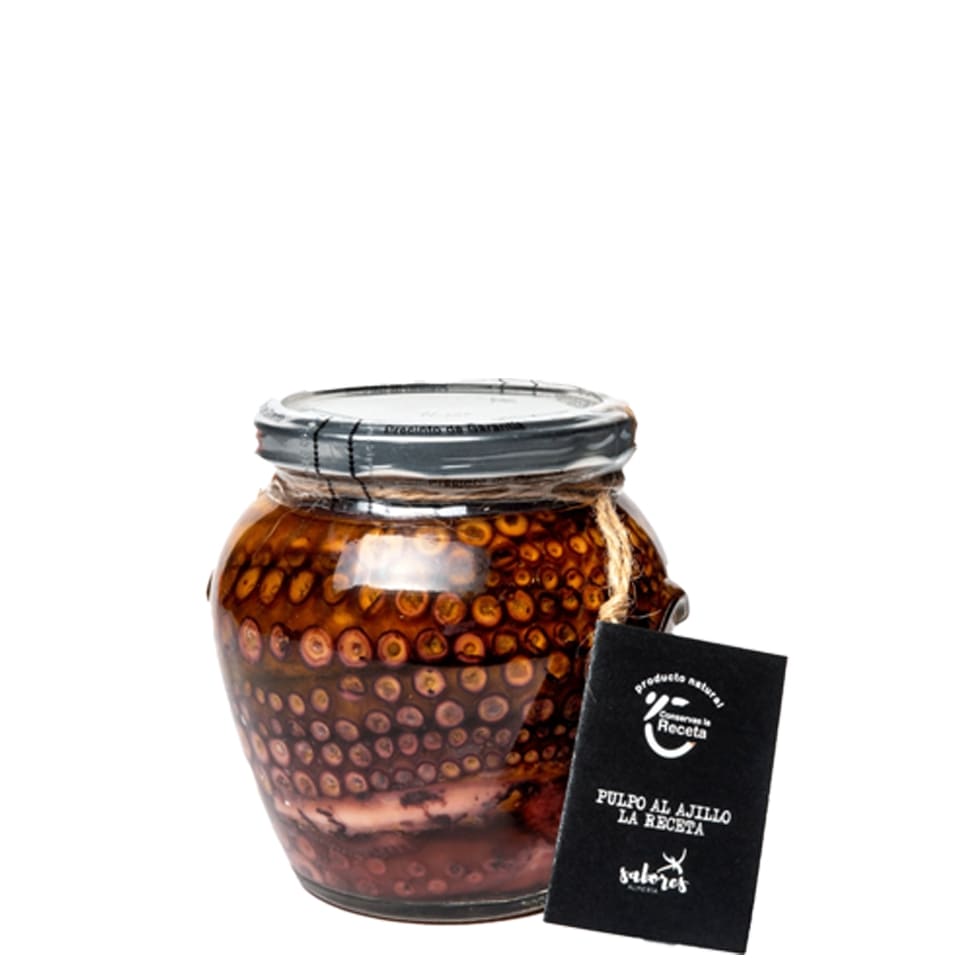 Φρεσκοαλιευμένο χταπόδι μέσα σε εξαιρετικό παρθένο ελαιόλαδο , ένα προϊόν που μπορεί να καταναλωθεί απευθείας ή να χρησιμοποιηθεί εξαιρετικά στην παρασκευή άλλων πιάτων.