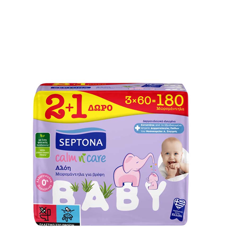 Τα απαλά μωρομάντηλα SEPTONA calm n’ care Αλόη είναι ιδανικά για την καθημερινή περιποίηση της ευαίσθητης βρεφικής επιδερμίδας από την 1η μέρα. Η ιδιαίτερα ήπια σύνθεσή τους με αλόη και βιταμίνη Ε καθαρίζει απαλά το δερματάκι του μωρού σας, διατηρώντας το ενυδατωμένο.